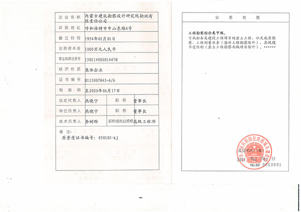 - 內(nèi)蒙古建筑勘察設(shè)計(jì)研究院勘測(cè)有限責(zé)任公司,是全國(guó)首家完成 轉(zhuǎn)企建制的省級(jí)建筑勘察設(shè)計(jì)單位。公司前身為內(nèi)蒙古建筑勘察 設(shè)計(jì)研究院勘測(cè)分院, 成立于1954年 ,經(jīng)過(guò)六十多年的發(fā)展, 現(xiàn)已成為全區(qū)技術(shù)力量雄厚、專(zhuān)業(yè)設(shè)置齊全的集巖土工程勘察 、 設(shè)計(jì)、治理、檢測(cè)、監(jiān)理、咨詢(xún)、水文地質(zhì)勘查、工程測(cè)量、科 研為一體的綜合性企業(yè) ... ... [查看詳情]